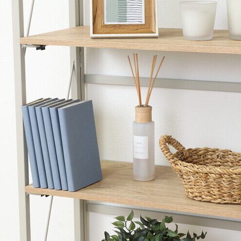 全体をスッキリ見せるスチールと組み合わせることで、リアルな木目模様がプリントされた棚板がよく引き立ちます。