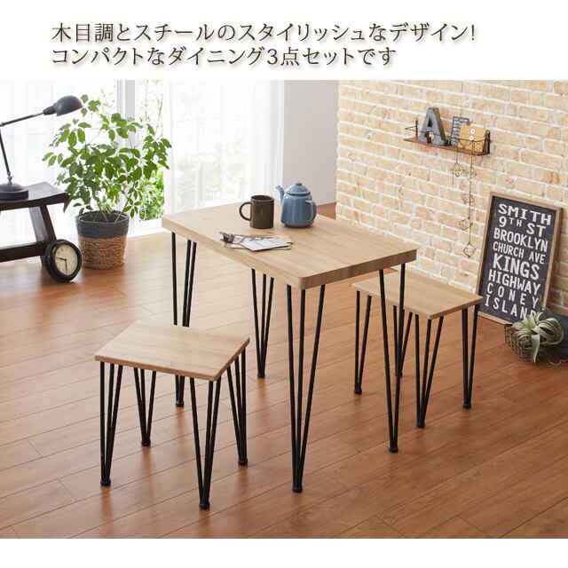木目調とスチールのスタイリッシュな組み合わせ!コンパクトなダイニング3点セットです。