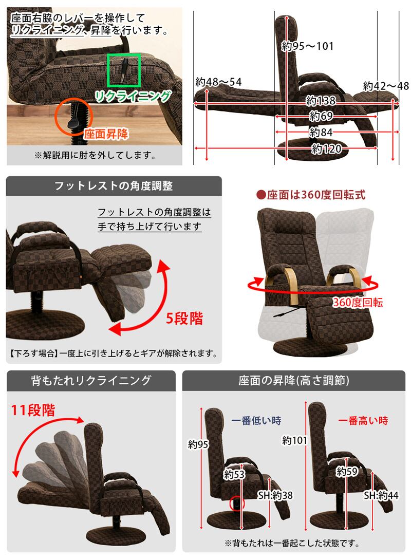 昇降式リクライニングチェア フット付き レバー式 家具 インテリア 椅子