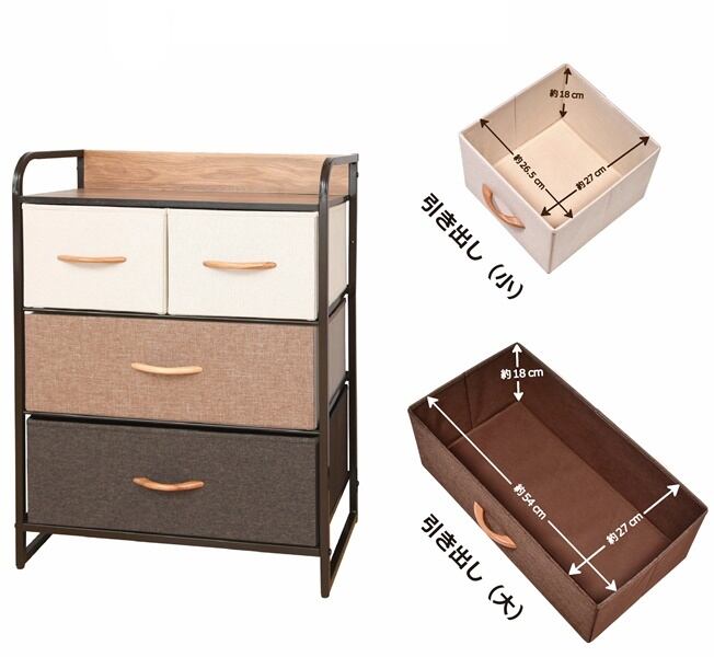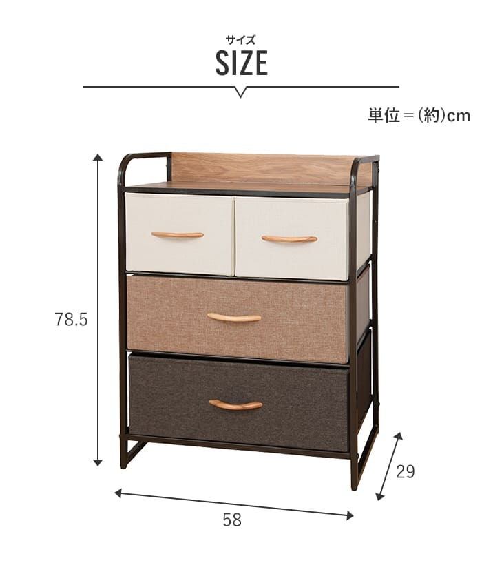 木目と布地がおしゃれでシンプルな布張りカラーチェスト、3段4杯タイプです。